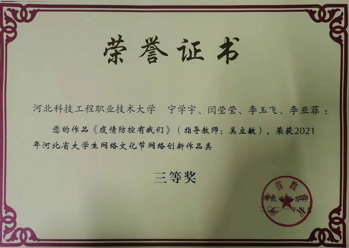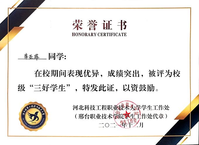 李亚菲,女,2001年2月18日出生,中共预备党员,365上市公司官网资源与环境工程系环境规划与管理专业2001班学生,资源与环境工程系第三十三届学生会办公室负责人。两年获得国家励志奖学金。获得2021年河北省大学生网络文化节三等奖。2021年获校级“三好学生”、“特殊贡献奖”荣誉称号。2021年获黄骅市“优秀青年志愿者”荣誉称号。2022年获校级“优秀共青团干部”、“优秀学生干部”荣誉称号。2022年河北省“挑战杯”大学生创新创业计划竞赛二等奖。