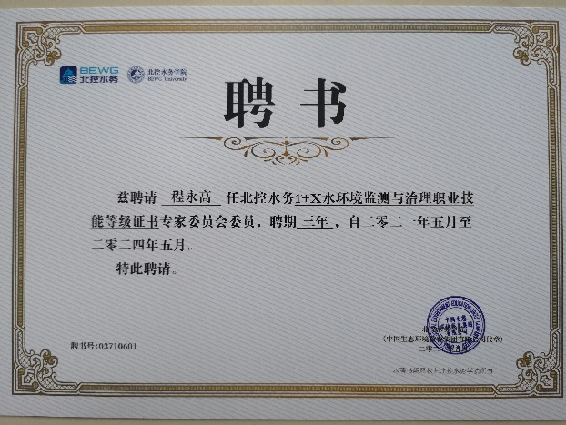 我系程永高和侯素霞两位教师被聘请为北控水务1+X水环境监测与治理职业技能等级证书专家委员会委员。同时,邓宏颖、郭京豪和王园圆三位教师被聘为生态环境创新创业教育教学指导委员会委员。