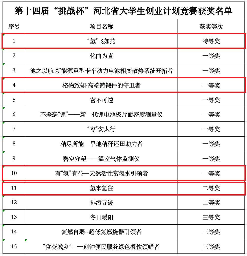 近日,由团省委、省教育厅、省社科院、省人力资源和社会保障厅、省科协、省学联共同主办的第十四届“挑战杯”河北省大学生创业计划竞赛圆满落下帷幕。资源与环境工程系的参赛团队凭借卓越的创新能力和扎实的专业知识,从全省113所院校的2066件作品中脱颖而出,其中,“氢”飞如燕项目荣获特等奖,格物致知和有“氢”有益两个项目荣获一等奖,氢来氢往项目荣获二等奖。